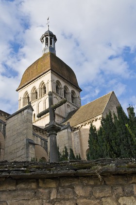 Façade occidentale de l'église Saint-André (1250-1290, XIIIe siècle) éclairée par le soleil couchant. Clocher néo-romantique remanié en 1923. - West facade of Saint-André (1250-1290, thirteenth century) illuminated by the sunset. Belltower neo-romantic revised in 1923.