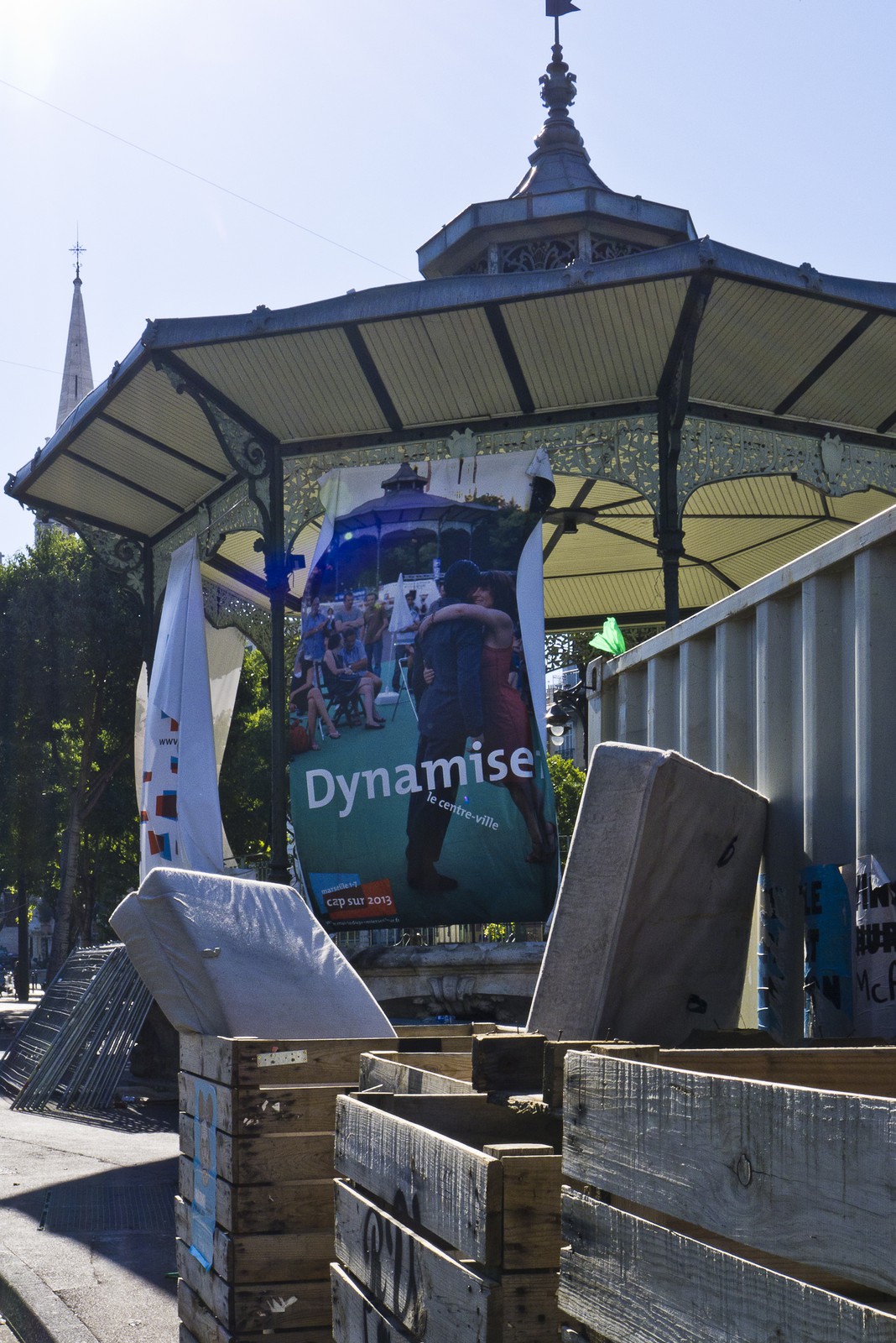 Description | Saletés et détritus divers devant le kiosque à musique, en haut de la Canebière. Les affiches sur le kiosque à musique annoncent une campagne pour "dynamiser le centre ville" et "valoriser le patrimoine" dans la perspective de Marseille 2013, capitale européenne de la Culture. - Various dirt and debris in front of the bandstand at the top of the Canebière. The posters on the bandstand announce a campaign to "revitalize the city center" and "the heritage develop " in prospect of Marseille 2013, European Capital of Culture. |